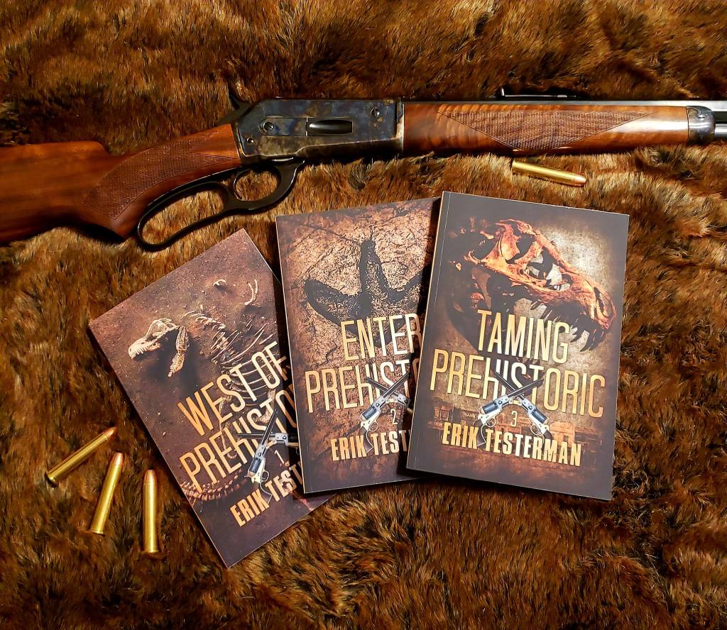 Kindle Unlimited. I bought a subscription and had a hard time finding anything that I liked. My wife challenged me to write my own and I did. Naively, I thought I’d have it finished within six months. Instead, it took 18 months to complete. When it came to the subject matter, I fell back on things that I love and always wanted to see more of. Cowboys and Dinosaurs. I wanted to write the sort of book that I’d want to read. But I also wanted it to be something I wouldn’t be embarrassed of when my kids read it, so I kept it rated PG-13. No sex, no F-bombs, just good ole fashion basic swearing and lots of action!