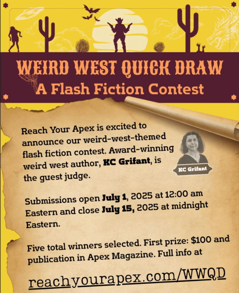 Details: https://reachyourapex.com/weird-west-quick-draw-a-flash-fiction-contest/